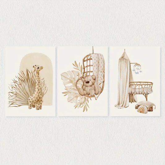 Set: 3 Canvas 'Giraffe, Beer & Wieg'