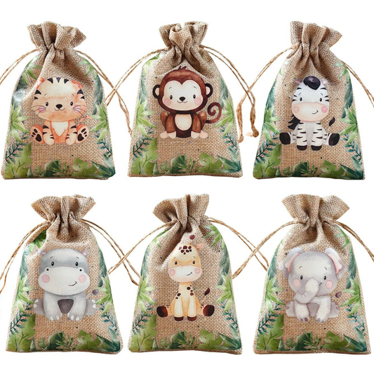 6 jute Uitdeelzakjes 'Jungle Dieren'