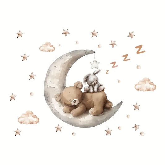 Muursticker 'Slapende Beer en Konijn op Maan'
